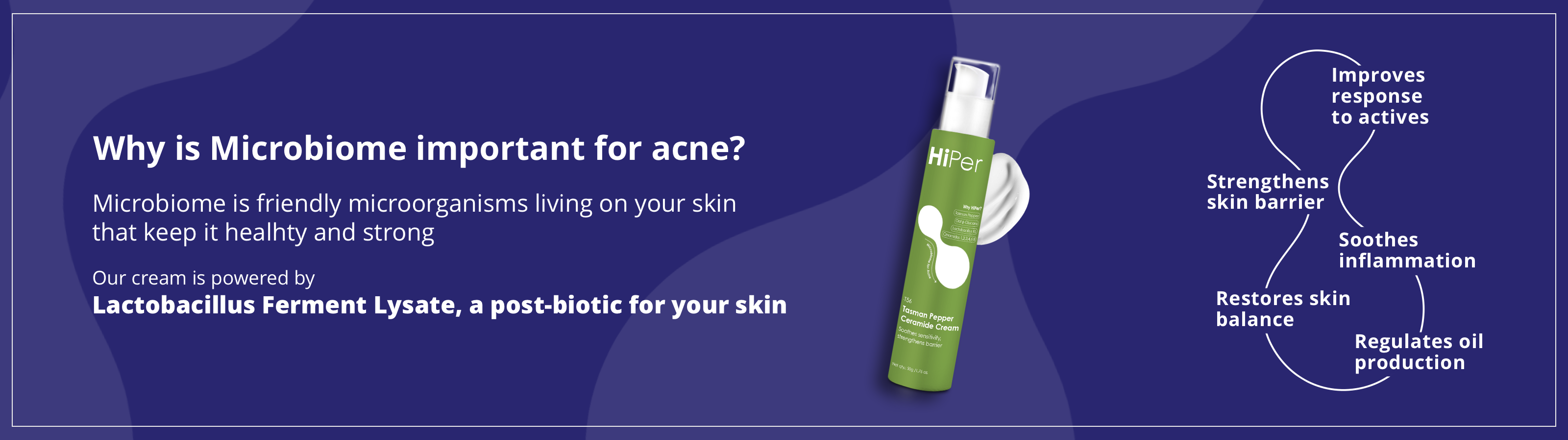 HiPer delivers high performance skincare with multi-active formulations precisely dosed to target your skin concerns from every angle. Unlike single-ingredient products, HiPer fights acne on multiple fronts—killing bacteria, repairing the skin barrier, and hydrating deeply. It also nurtures your skin's microbiome with pre, pro, and post-biotics for balance and resilience.